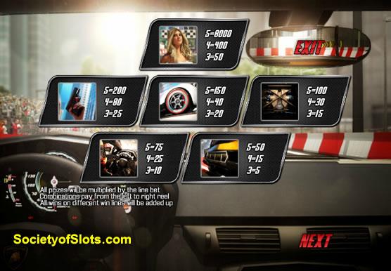 Bonus Round - When players get 3x bonus symbols which is a map of the race circuit on any reel; the bonus feature will be activated. Players are then taken to a race map where they pick from 20 check points to win great prizes. Be careful though, once you pick the check point that says "collect", this will end the bonus round and all your winnings will be added upand paid out.