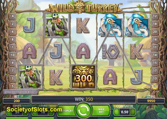 Wild Turkey Slot Machine is one of the newest casino games powered by Net Entertainment. Players are taken on a journey to a remote mountain where a tribe of turkeys worship the Wild symbol. The animations are quite static for a new genre slot game and the audio consists of a low beat in the background. On first appearance Wild Turkey is not the most compelling of slot machines.
